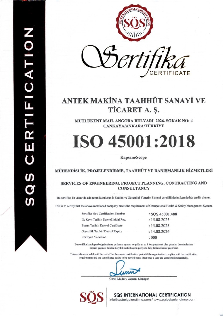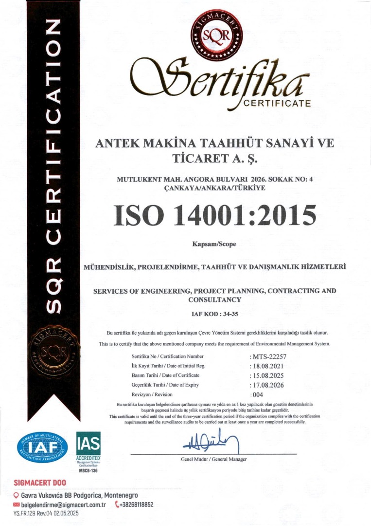 Dünyaca ünlü firmalarla ortaklıklar kuran Antek, ISO 14001:2015, ISO 9001:2015 ve ISO 45001:2018 belgelerine sahiptir.